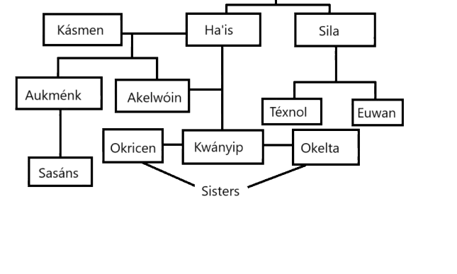 He would be treated like a pariah for the rest of his mortal lifespan. He also had a brother called Sila, who along with his children Téxnol and Euwan turned into a mountain somewhere in the past, and lastly, another son, Aukménk, who made him a grandfather by having two children with an unknown female (Howenh? human?), both called Sasán. To those who feel lost with all those names, here’s a family tree I have quickly made to summarize everything, including Kwányip’s future wives.